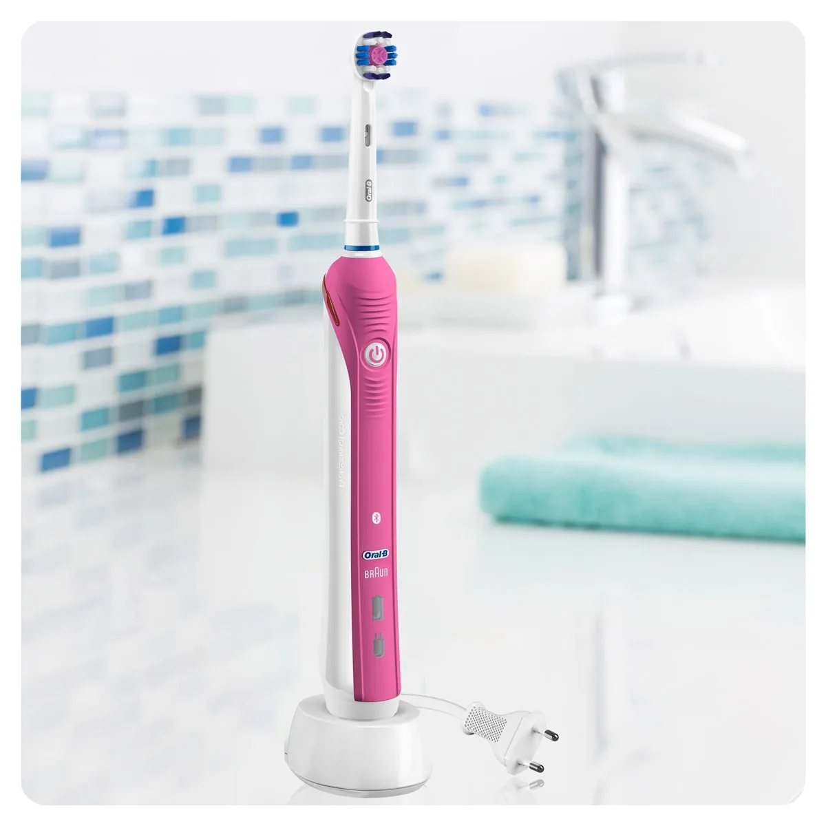 Experience Oral-B Smart 4, from the brand that brought you the first ever connected rechargeable toothbrush. The sleek pink handle of the 4000W electric toothbrush improves your brushing habits. It seamlessly connects with the Oral-B app in your phone and guides you with real time feedback to brush better. While you are improving your brushing routine, Oral-B's unique round head does all the rest. It removes up to 100% more plaque than a standard manual toothbrush for healthier gums and it starts making your smile whiter as of the first day of brushing by removing surface stains. Not only this, but the toothbrush helps you protect your delicate gums with the proprietary pressure control technology that reduces brushing speed and alerts you to be gentler if you brush too hard. With the Smart Coaching you get from Oral-B Smart 4, 4000W toothbrush, you will improve your brushing habits and your oral health. Oral-B Smart 4, 4000W electric rechargeable toothbrush is compatible with the following replacement toothbrush heads: Cross Action, 3D White, Sensi Ultrathin, Sensitive Clean, Precision Clean, Floss Action, Tri Zone, Dual Clean, Power Tip, Ortho Care.