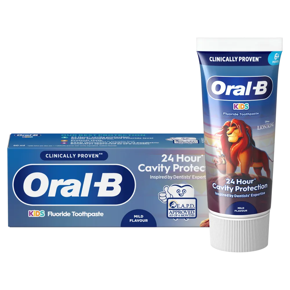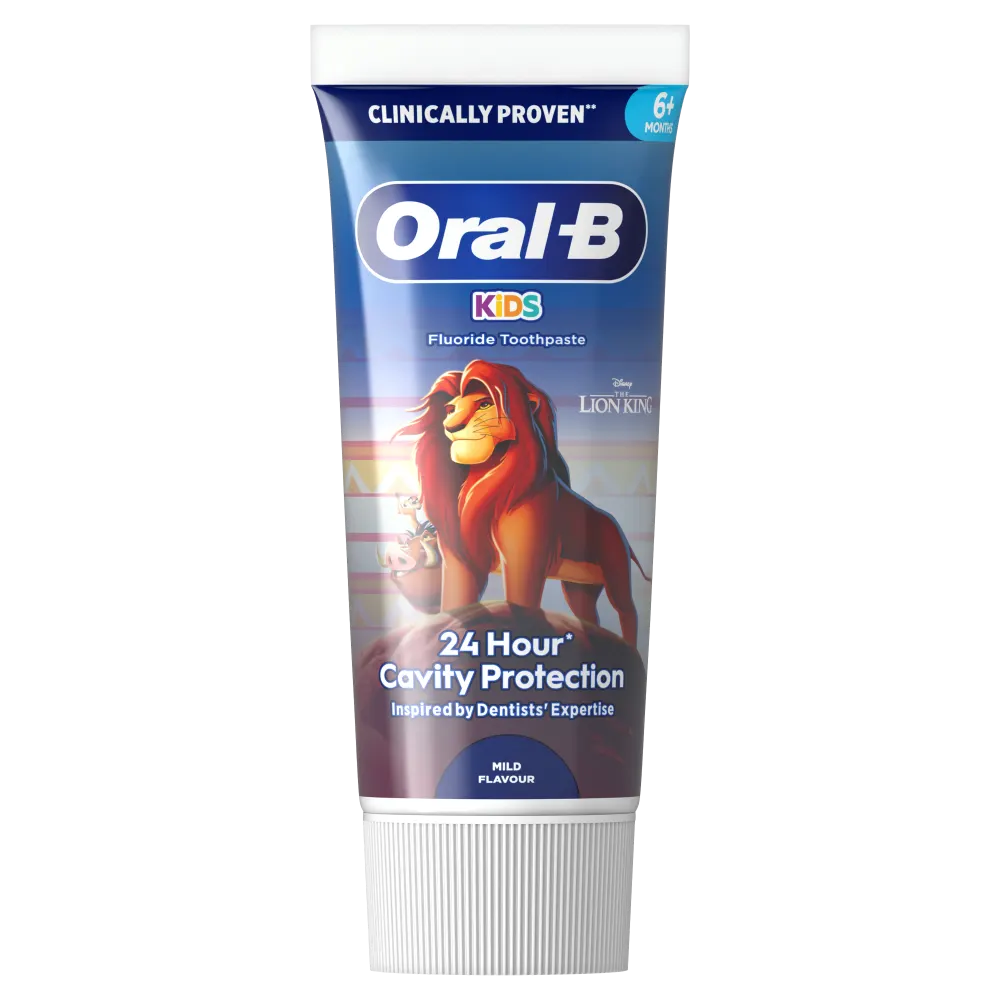 Oral-B Kids Toothpaste 6+ Months - 6 Years, Lion King, Mild Fruity Flavour, is clinically proven anti-cavity with Sodium Fluoride. It provides 24 hour cavity protection when used twice daily, with a Sugar Shield. Inspired by dentists’ expertise, uniquely designed for kids. Gentle formulation and fluoride level specially developed for children. Protects teeth from acids and sugars in everyday food. Recommended by the Academy of Paediatric Dentistry from 6 months onward.