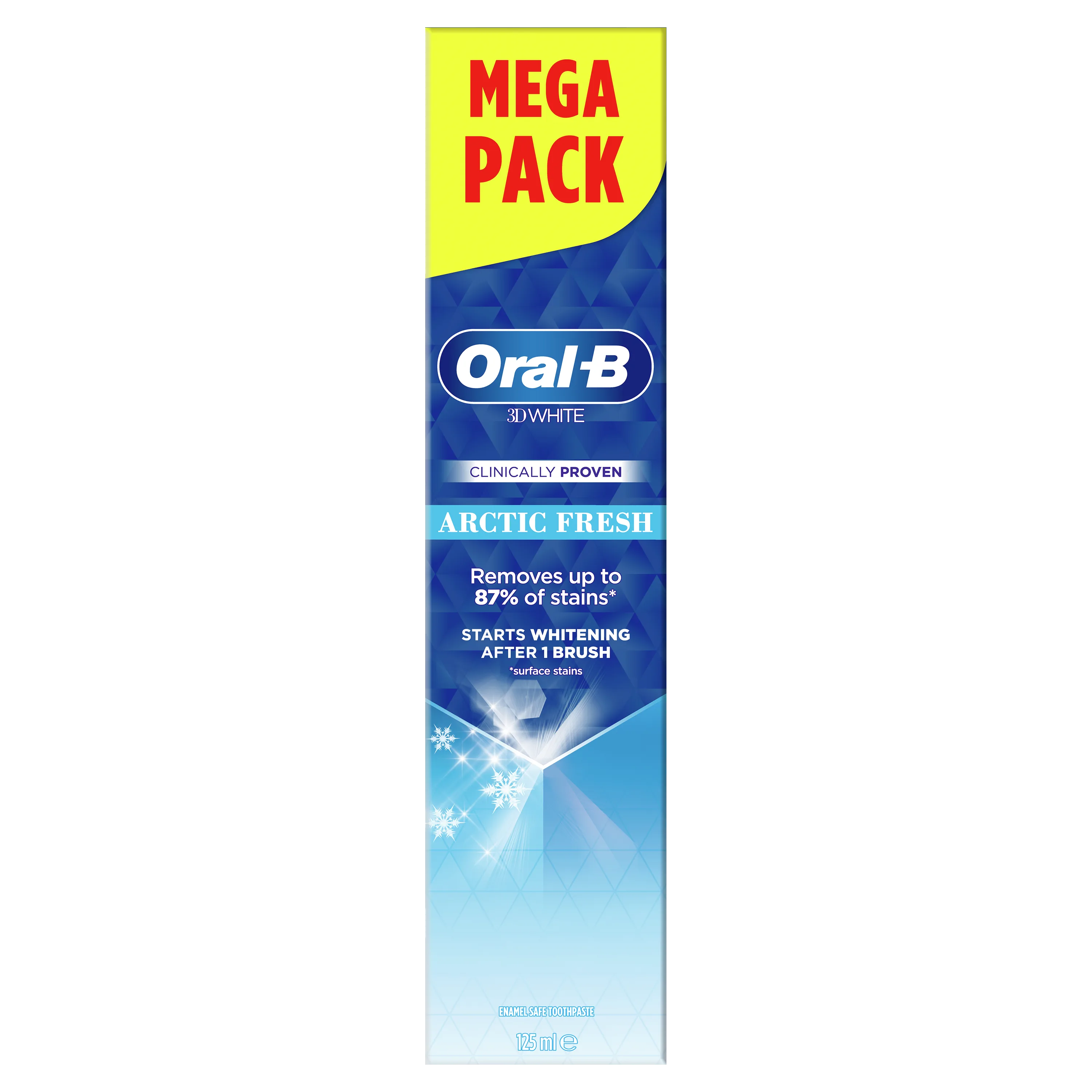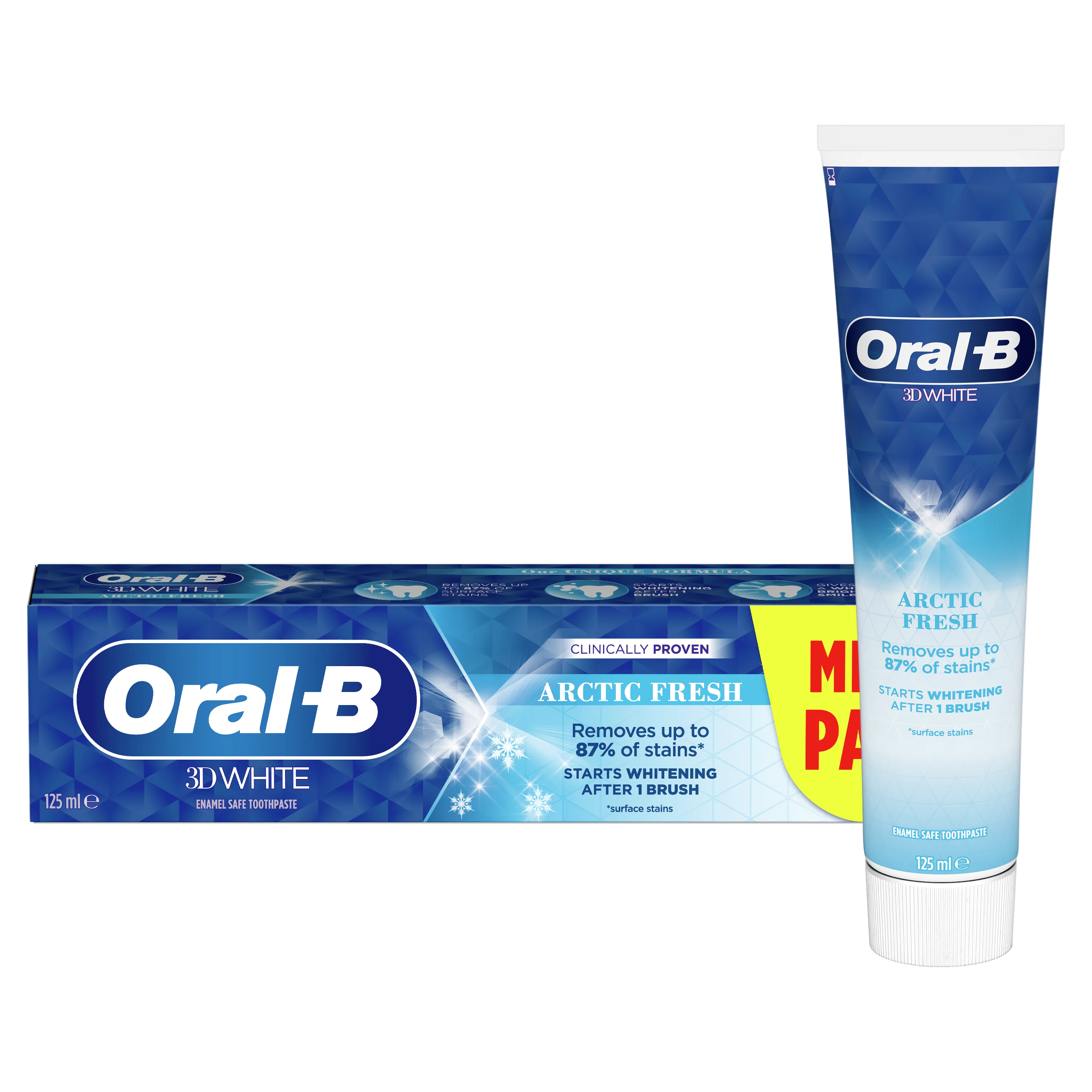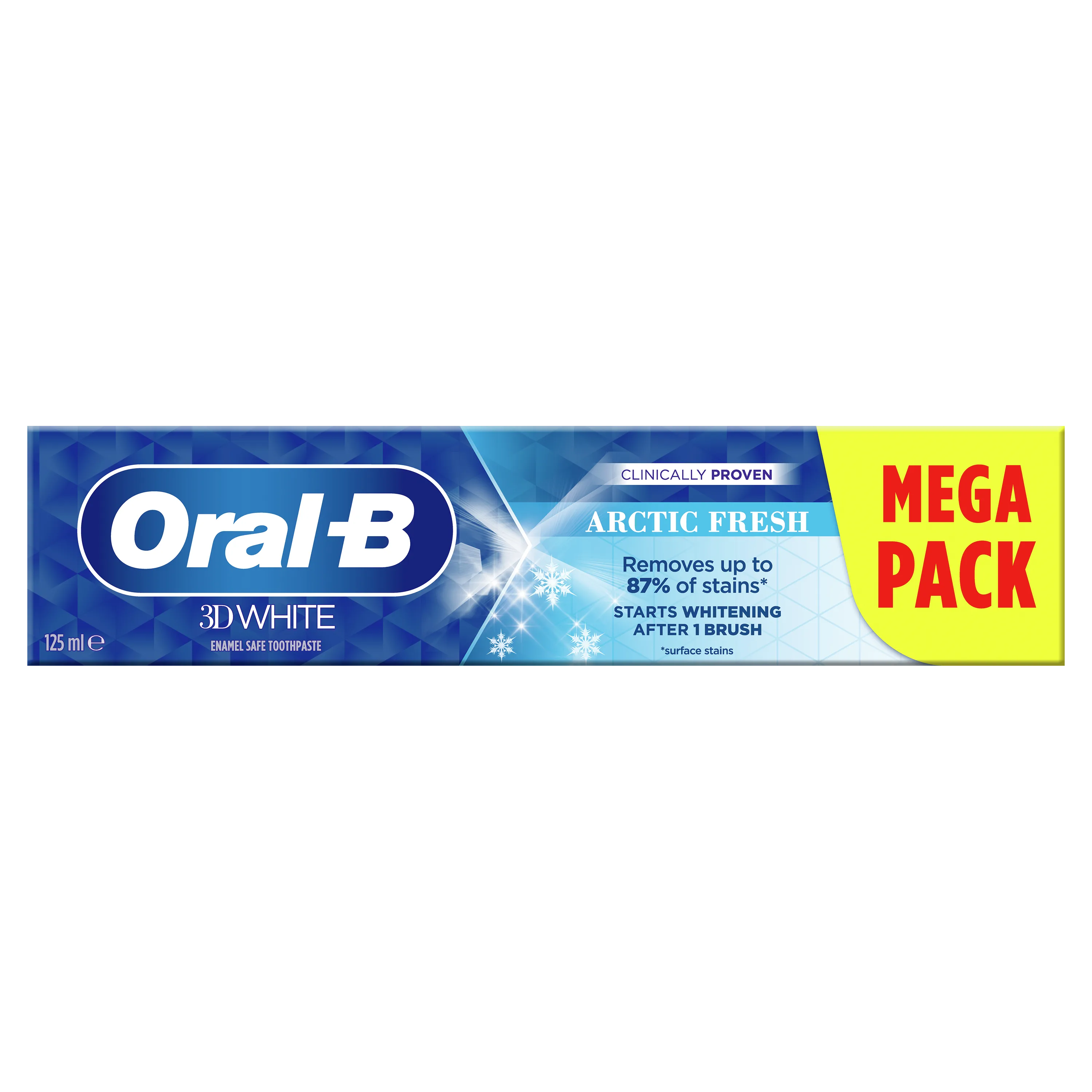 Oral-B 3D White Arctic Fresh toothpaste is clinically proven, removes up to 87% of surface stains and starts whitening after 1 brush