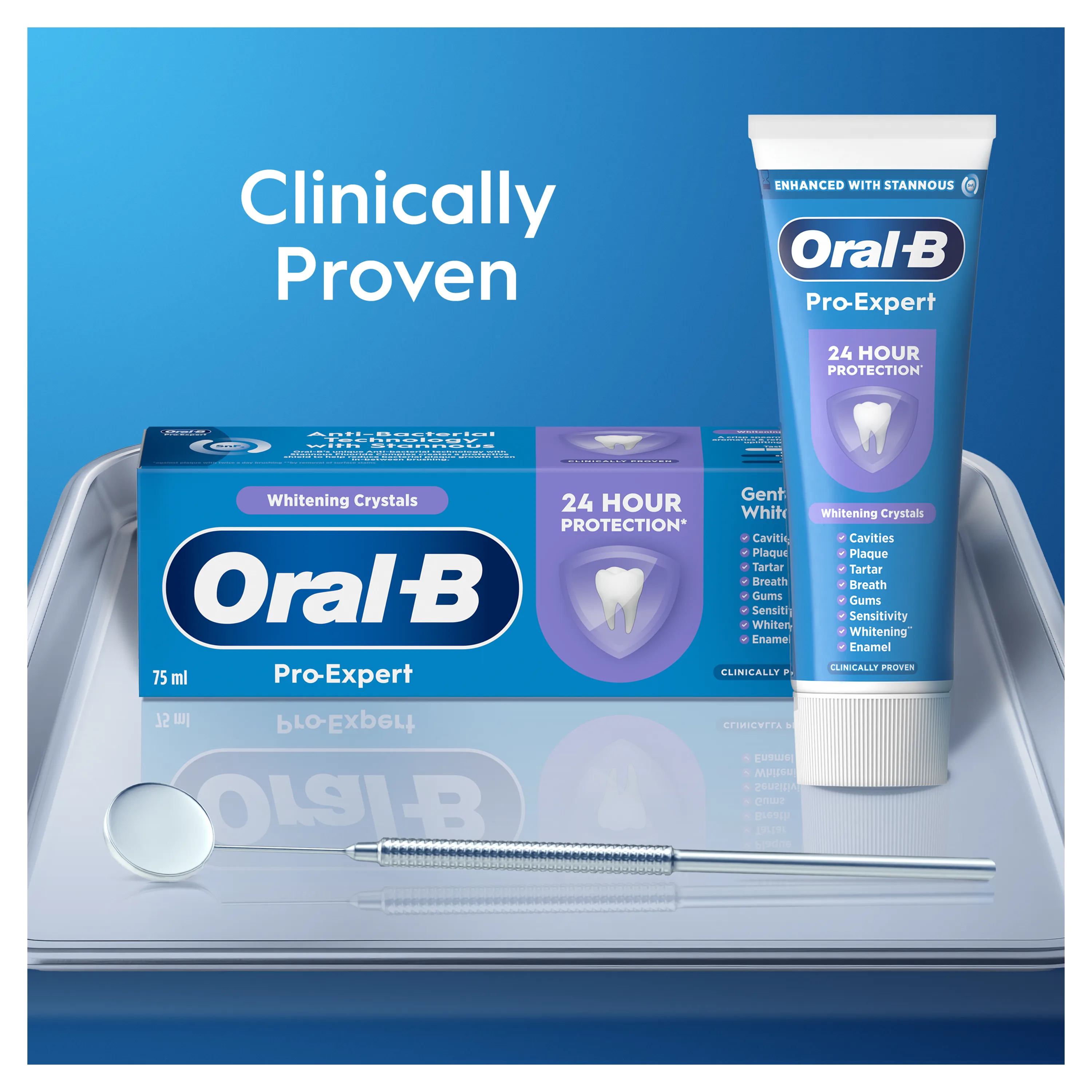 Oral-B Pro-Expert Gentle Whitening toothpaste is clinically proven to provide 24 hour protection when used twice a day. The anti-bacterial technology with Stannous Fluoride Complex creates a protective shield to help reduce bacterial plaque growth even in between brushing. A crisp spearmint blend with sweet aromatics & refreshing menthol for an uplifting cool sensation.